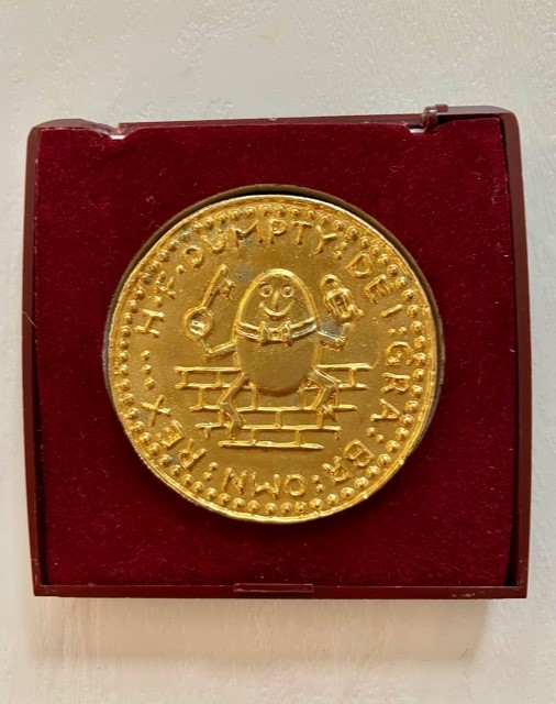 Woodrow was also very interested in concepts of unity, and particularly its tension with concepts of division. The verso of the coin, completely at odds with the sweet and smiling Humpty Dumpty, is a military tank wrapped up in a ribbon- a reference to the highly televised 90s Croatian war. The work is loaded with contradictory thoughts and feelings- even visually it’s very simple, but it navigates complex concepts like war and neoliberalism with thoughtfulness. I like it a lot!”