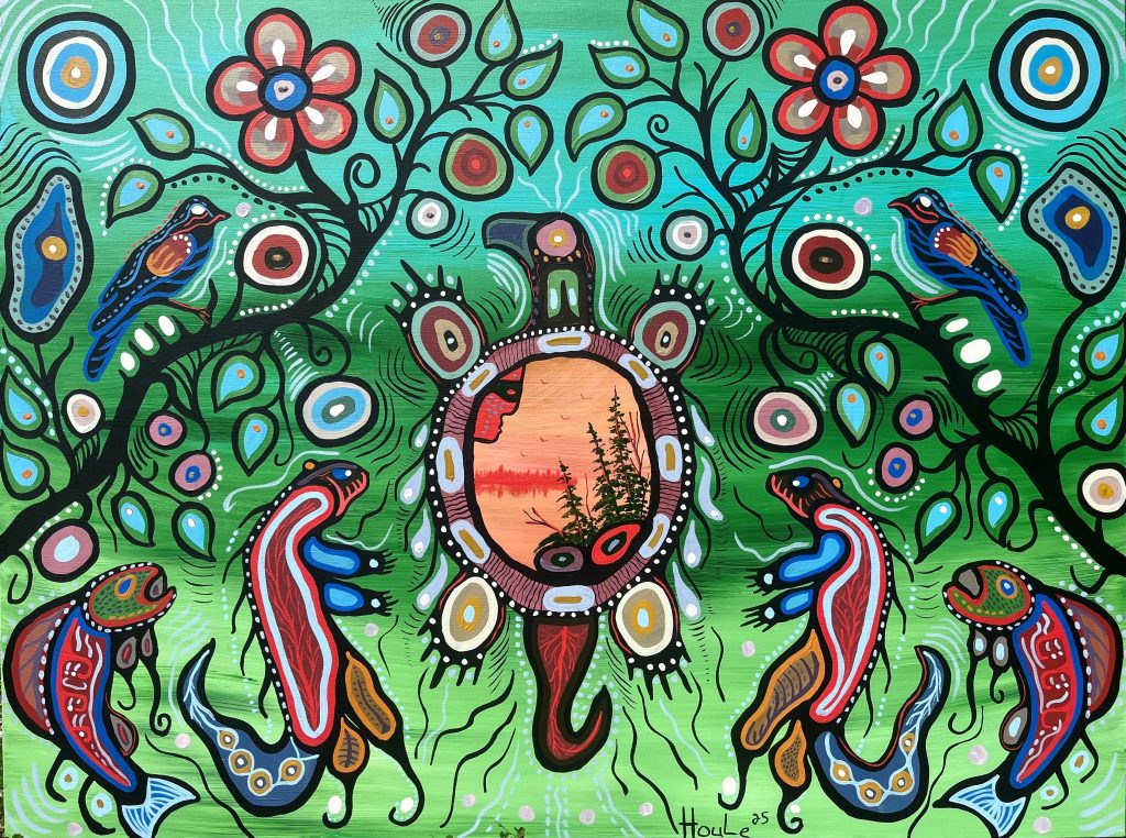 Houle is of French and Anishinaabek ancestry, and he grew up in North Bay. As a youth, he recalls seeing Morriseau’s work in the window of a local gallery and later being transfixed by the Ojibwe artist’s story.