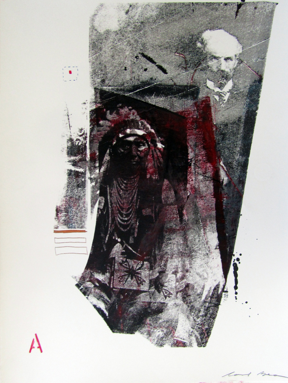 Positioned around the central image of the Nez Perce leader and the professor are abstract elements rendered by the artist’s hand, such as a red letter “A” in the lower left corner, and, in the upper left, a red dot enclosed within a square composed of broken lines. The presence of these ambiguous elements encourages the viewer to similarly approach photographic imagery as multivalent rather than as sources of fixed meaning.
