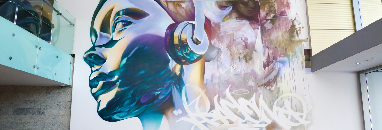 Alexander Bacon and Moises Luvs are two generations of artists working within graffiti and hip hop, collaborating for the first time at AGH. Their aim with Reflect is to depict the states of flow, a feeling that transcends and unites all the art forms within hip-hop. “The abstraction surrounding the character with headphones reflects the internal multi-layered transformative experience of being so deeply connected with your purpose and actions. The state of flow is achieved when one is fully attuned with themselves and allows the ‘flow’ to flow through them.” – Moises and Bacon
