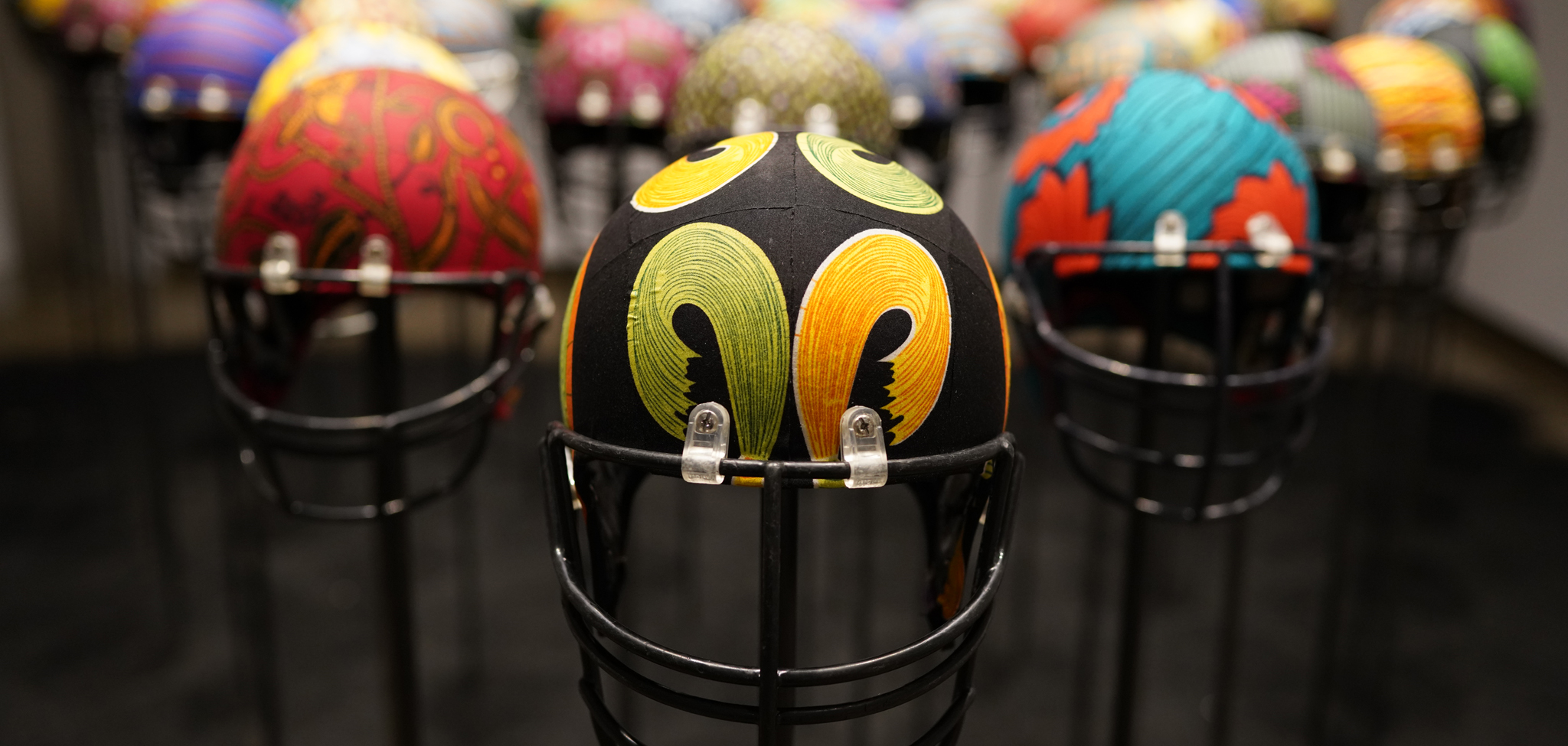 Header Image: Esmaa Mohamoud, Glorious Bones, 2018-19, 46 repurposed football helmets, African wax prints, faux soil, metal. Courtesy of Georgia Scherman Projects. Photo courtesy of the artist.