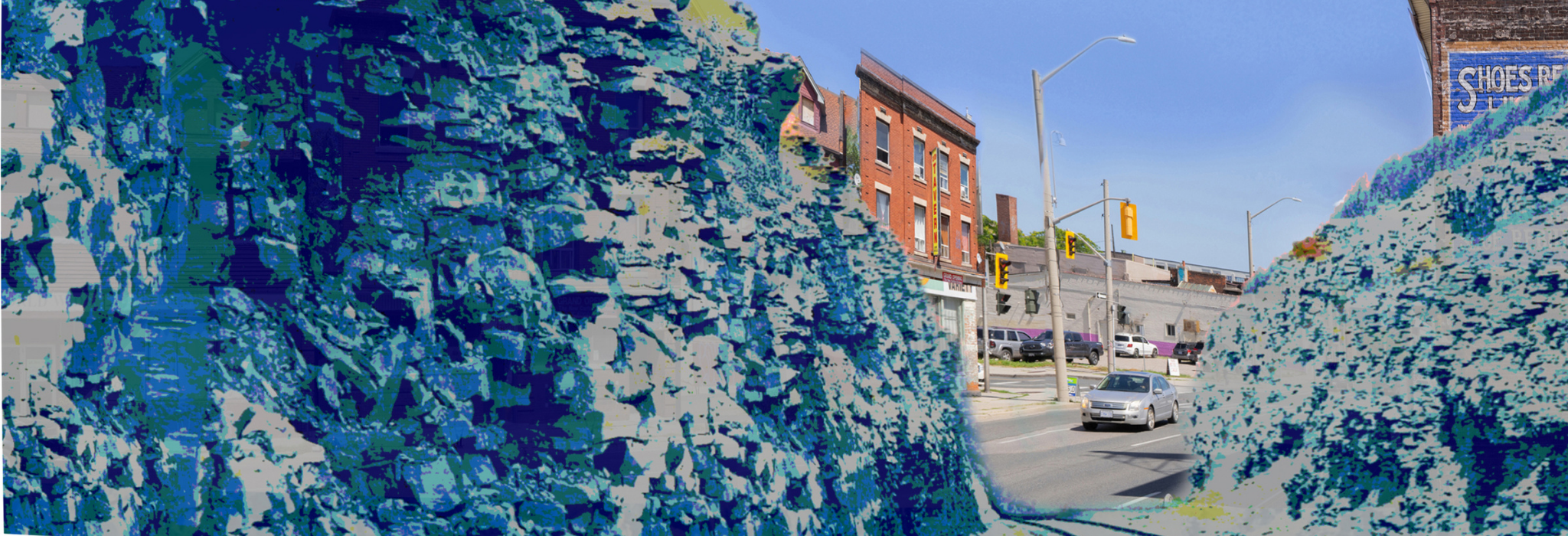 In this solo exhibition of recent works, Hamilton-based artist Ingrid Mayrhofer explores the image of a changing city. Video collages and digital photomontages document the altered streetscape during the process of demolition along King Street East in preparation for the City’s planned Light Rail Transit (LRT).
