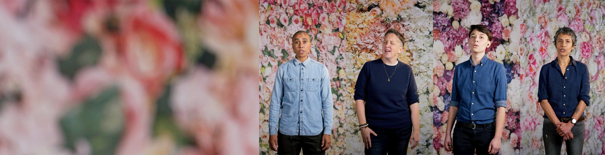 Created for this exhibition, Quantum Choir reflects on the vulnerability of learning to sing as a way of exploring the legibility, precarity, and affinity of contemporary queer female masculinity. Set in a custom architectural structure in the centre of a large gallery space, the video installation brings together four participants, including the artist, to work through the insecurity, worry and shame of being a bad singer. Following weeks of voice lessons with a vocal coach, the participants collaboratively construct a performance for the camera, progressing from initial vocal warm-ups right through to singing the same pop song. As in previous works, Clarke here uses performative gestures and repetition across the four screens to construct a video choir that harnesses queer kinship and intimacy to navigate a complex mix of privilege, oppression, power and invisibility.