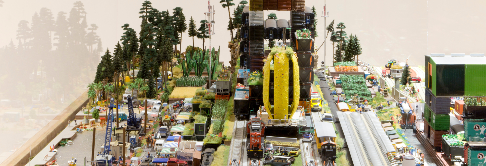 Kim Adams (Canadian b.1951), Artists’ Colony (Gardens), 2012, HO scale model parts, fitted vitrine. Photo: Robert McNair, 2019