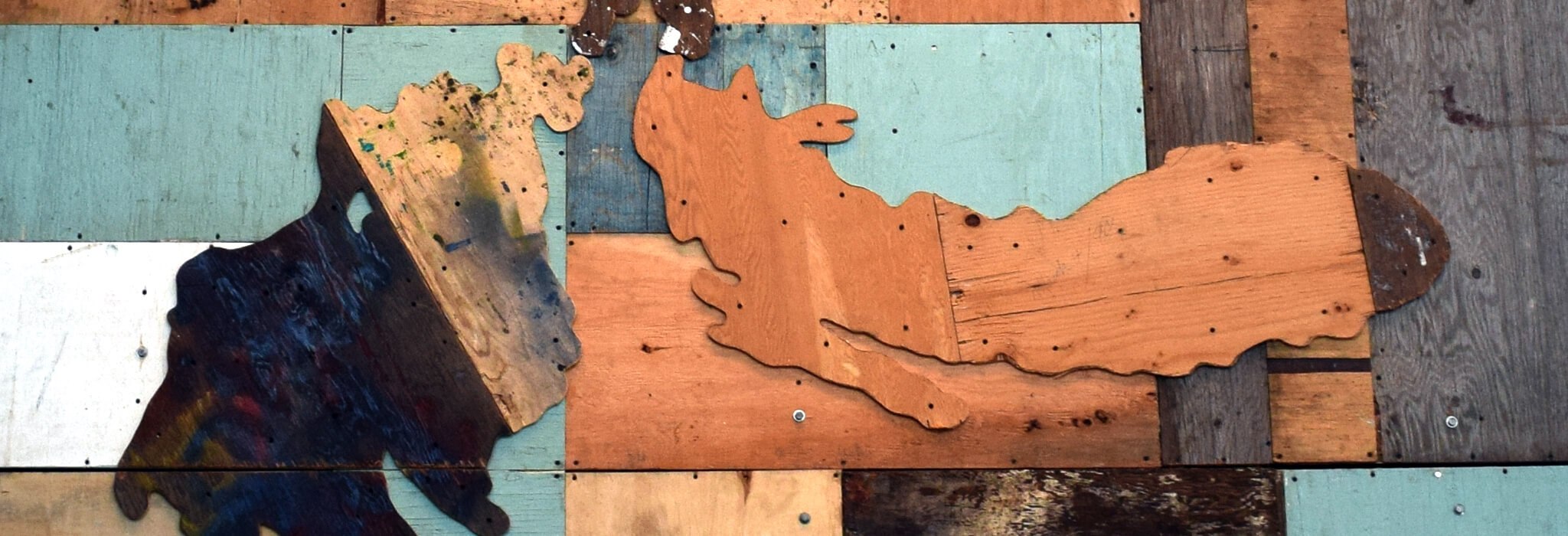 Hamilton-based artists’ collective TH&B has constructed an idiosyncratic aerial view of the Great Lakes mounted on a large-scale billboard installed on the wall of the AGH foyer. Part of their ongoing exploration and mapping of the Great Lakes and escarpment through a variety of artworks and actions, Declaration is at once a sculptural assemblage and a performative surface onto which the team affixes multiple layers of material and meaning.