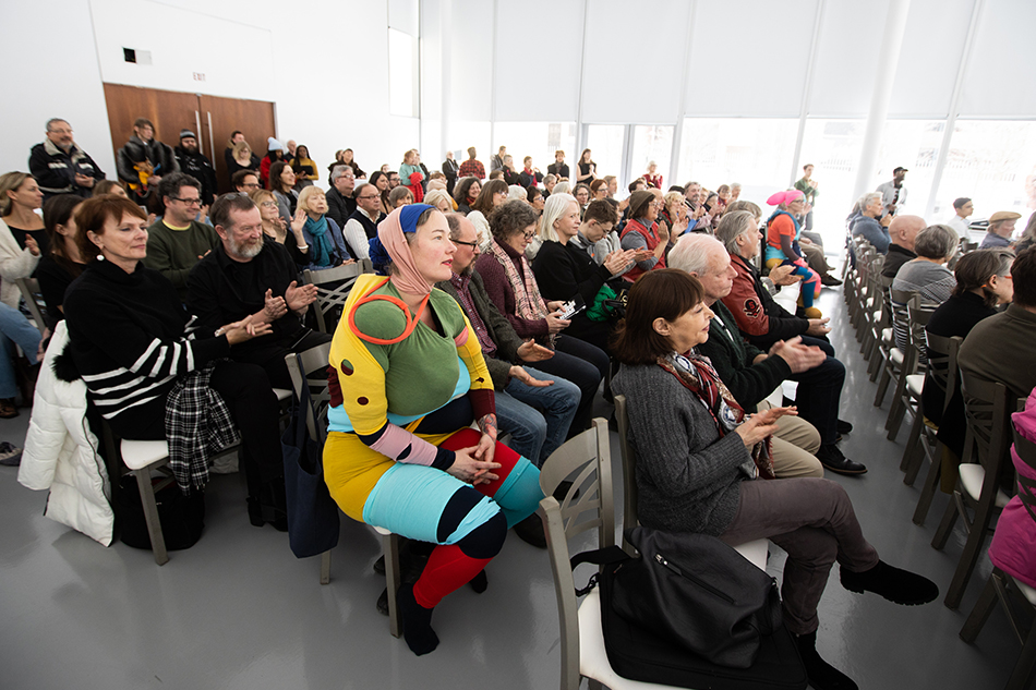 Delivered as part of Watch It Burn, a music/film/performance series coordinated by Zula Creative Music and Arts, the first UNDERCUT performance took place at the AGH on February 8, 2020, during the exhibition opening for Early Snow. The performance began silently, and inauspiciously, and immediately following a screening of John Oswald’s homonymy, a 10-minute homage to Snow’s 1982 film work So Is This. The four members of F(N)OR (Donna Akrey, Margaret Flood, Svava Thordis Juliusson, and Nancy Anne McPhee who was a temporary substitution for member Andrea Carvalho), stood up as if to leave, and then began casually walking circles around the audience.