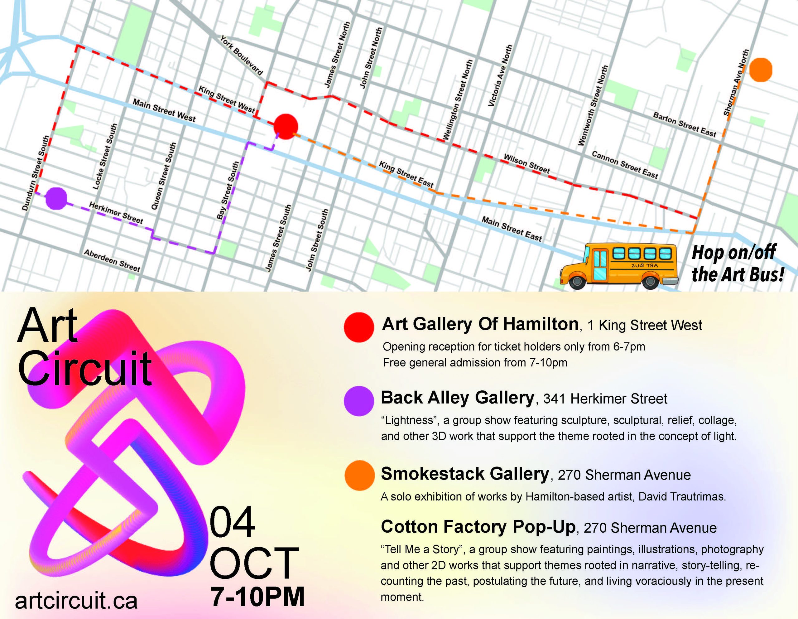Art Circuit provides opportunities for collectors & art enthusiasts alike to meet & engage with local artists & gallerists to celebrate the local art scene in Hamilton! Take a ride on a unique bus tour that provides transportation to multiple gallery opening receptions taking place on the same night, including the Art Gallery of Hamilton!