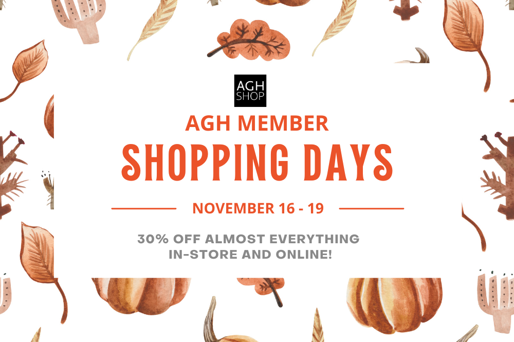 Extra shopping discounts are coming November 24 – December 7 to the AGH Shop for all our Members.