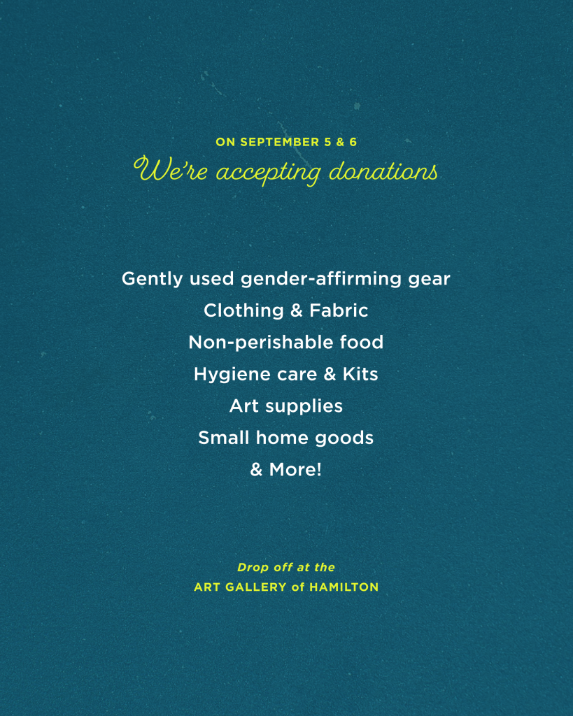 On September 5 and 6, the AGH will accept the following donations: Gently used gender-affirming gear, clothing and fabric, non-perishable food, hygiene care items, art supplies, small home goods, and more.