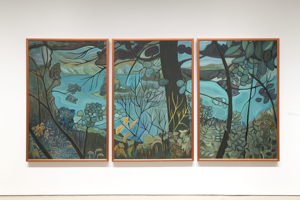 Niro decided to create The Grand Behind Glenhyrst as three separate panels for practical reasons. Because the work is so large, she spread the image over three canvases for the ease of getting it out of her studio and transporting it.