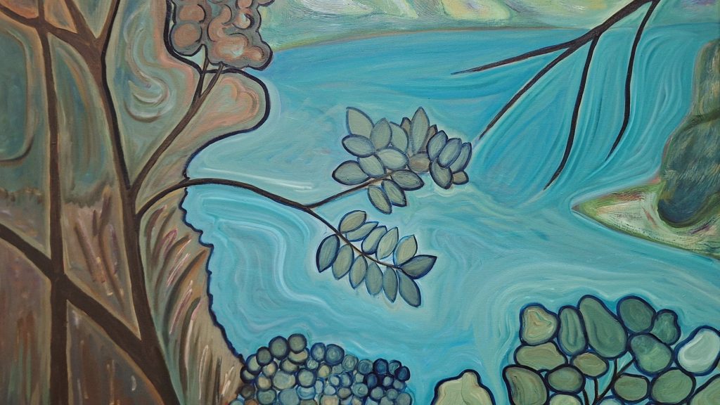 “My walk along the river conjured up questions in my mind about how this land belonged to us once upon a time but somehow no longer does,” explains Niro. “Through the painting, I wanted to pay tribute to the Grand River and its history.”